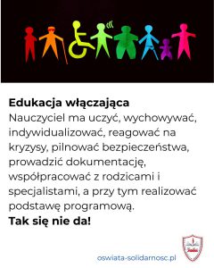 Jeśli edukacja włączająca ma mieć sens, to musi być oparta na realnych warunkach: mniejszych klasach, większej liczbie specjalistów, jasnych procedurach, lepszym finansowaniu i prawdziwym wsparciu dla nauczycieli. Bez tego będzie tylko kolejnym hasłem, za które najwyższą cenę zapłacą dzieci i szkoły publiczne.