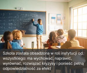 Szkoła została obsadzona w roli instytucji od wszystkiego: ma wychować, naprawić, wyrównać, rozwiązać kryzysy i ponieść pełną odpowiedzialność za efekt. Odpowiedzialność ta jednak rzadko bywa wspólna. Gdy pojawia się problem, ciężar niemal zawsze spada na nauczyciela i dyrektora, a rodzic coraz częściej występuje jako klient składający reklamację, nie partner w wychowaniu.